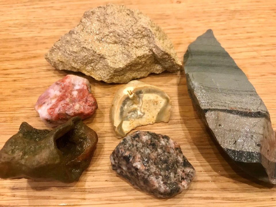 Fragments of rocks found around Rutland Water, the oolitic limestone is at the top, a green-grey stripy volcanic rock is to the right, then chert (white), quartz (red), ironstone (brown) and granite (grey, white, black, pink).  Source: BGS © UKRI