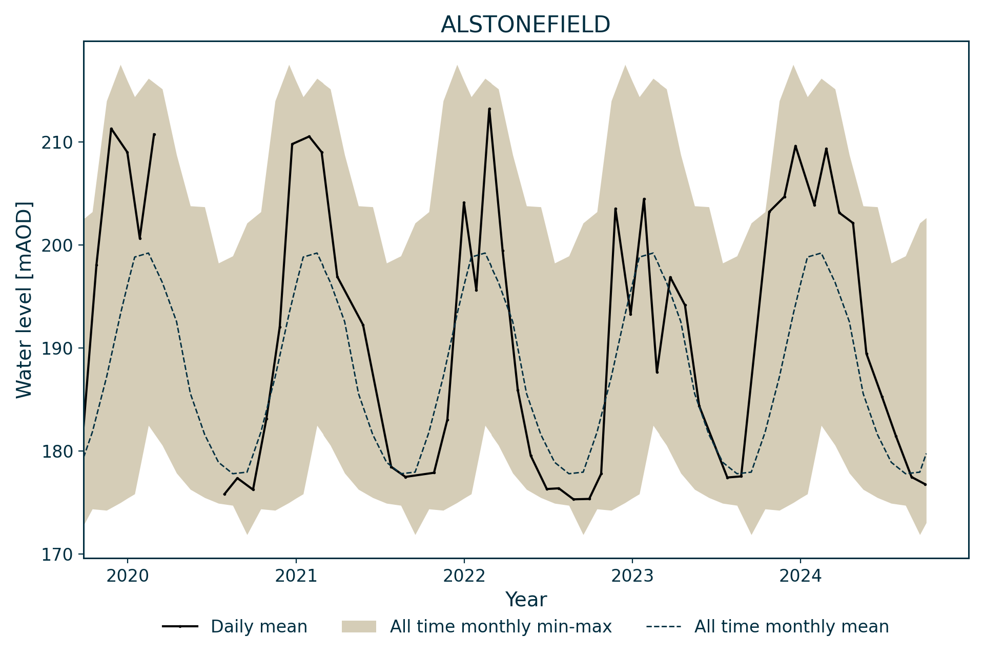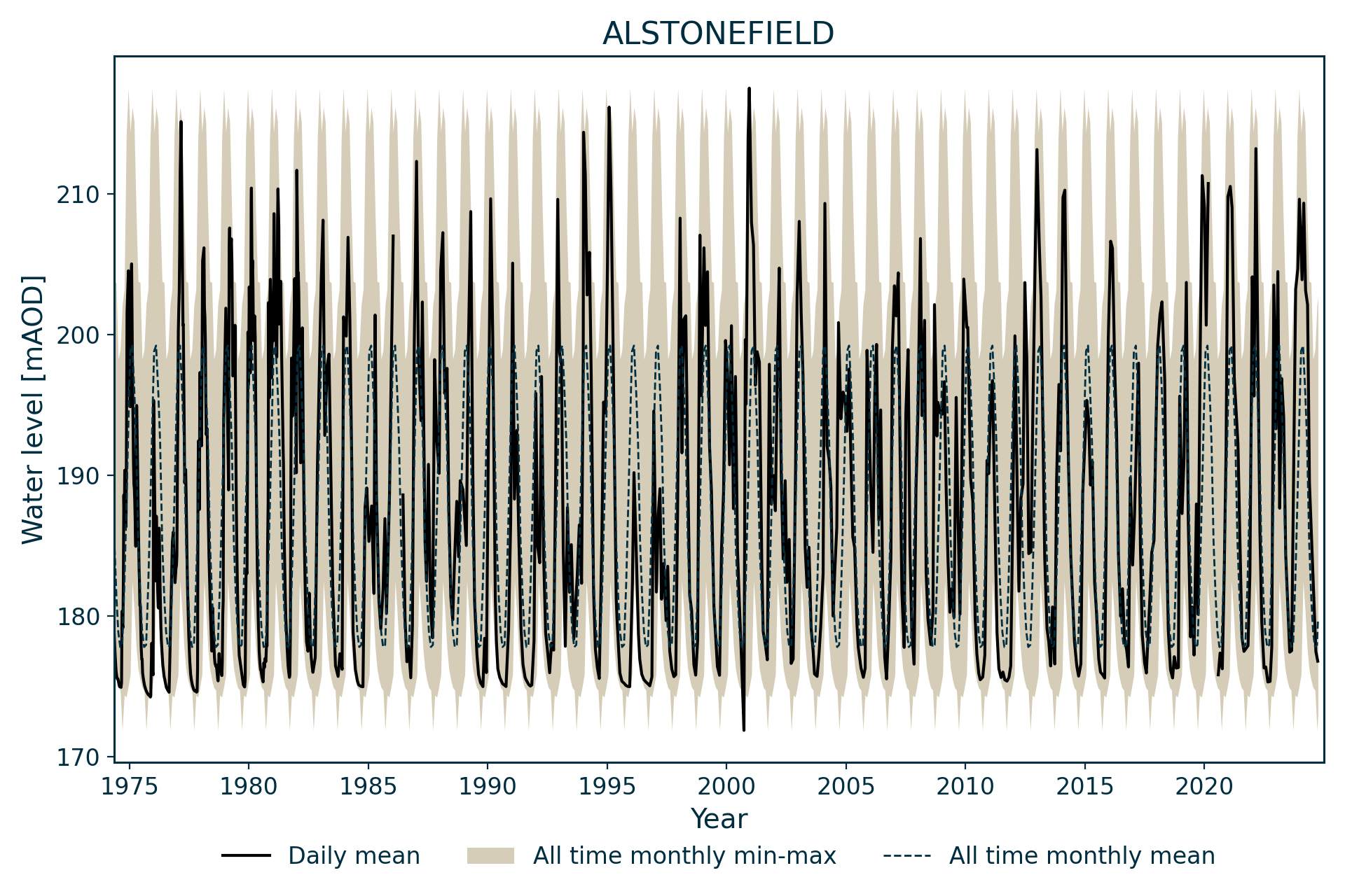The borehole at Alstonefield in the Peak District measures water level in the Carboniferous-aged Hopedale Limestone Formation. Our records date back to 1974.
