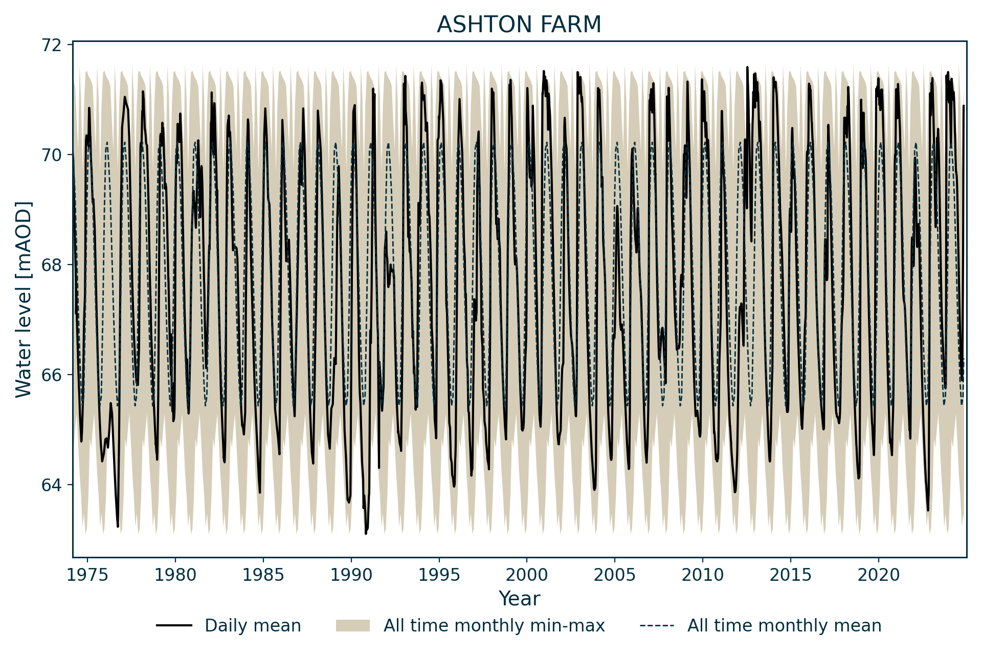 The hydrograph has an annual sinusoidal appearance, with some response to intense winter rainfall events. Its response is rapid for a chalk well, presumably because of its shallow depth. It appears to have an unconstrained response, although levels tend to peak close to 71 m AOD, and have only been lower than 64 m on rare occasions.