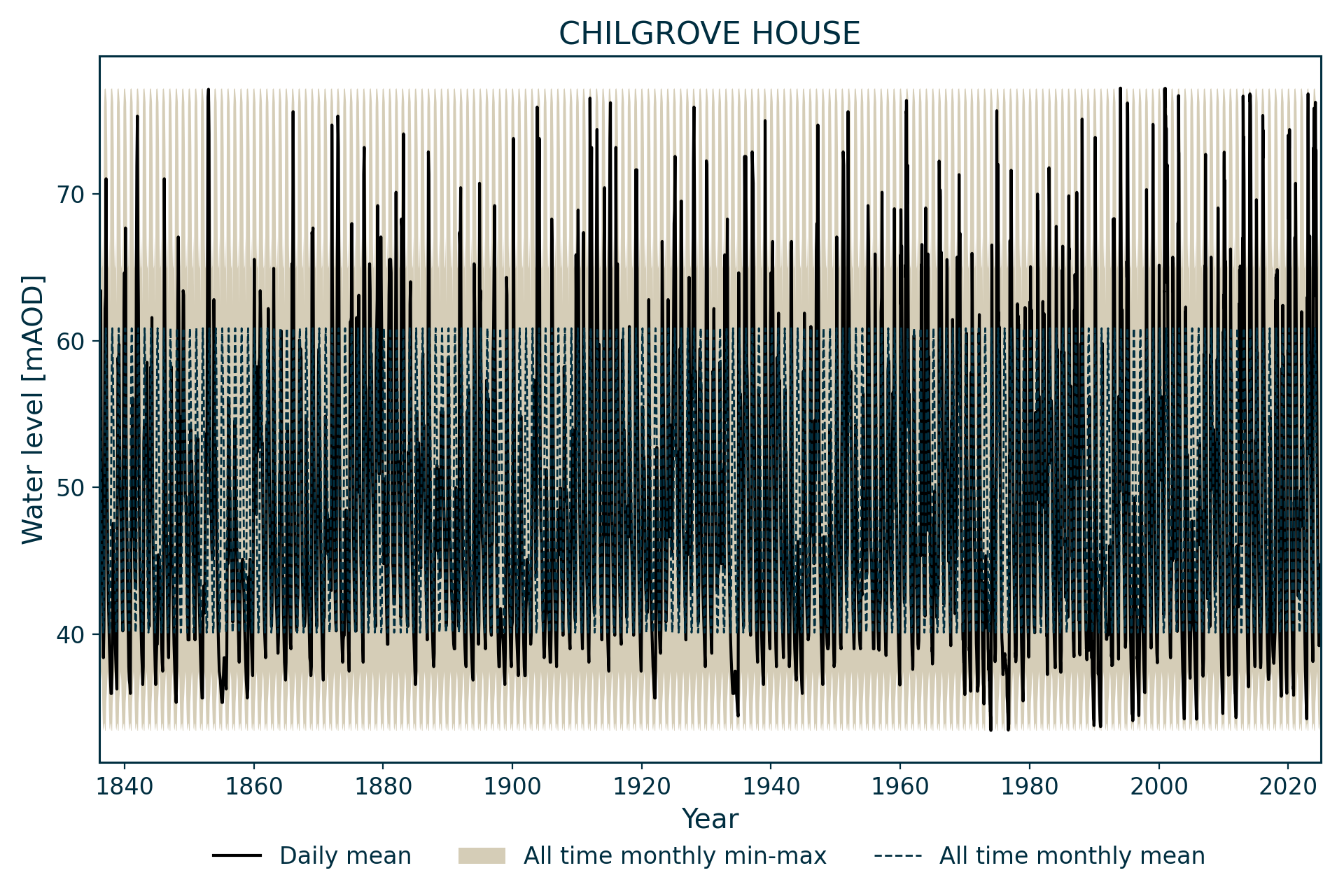 Early data is subject to various errors. The data for the period March 1942 to April 1943 was not collected and is extrapolated from a well at Compton (SU 7755 1490), 6.5 km to the west.