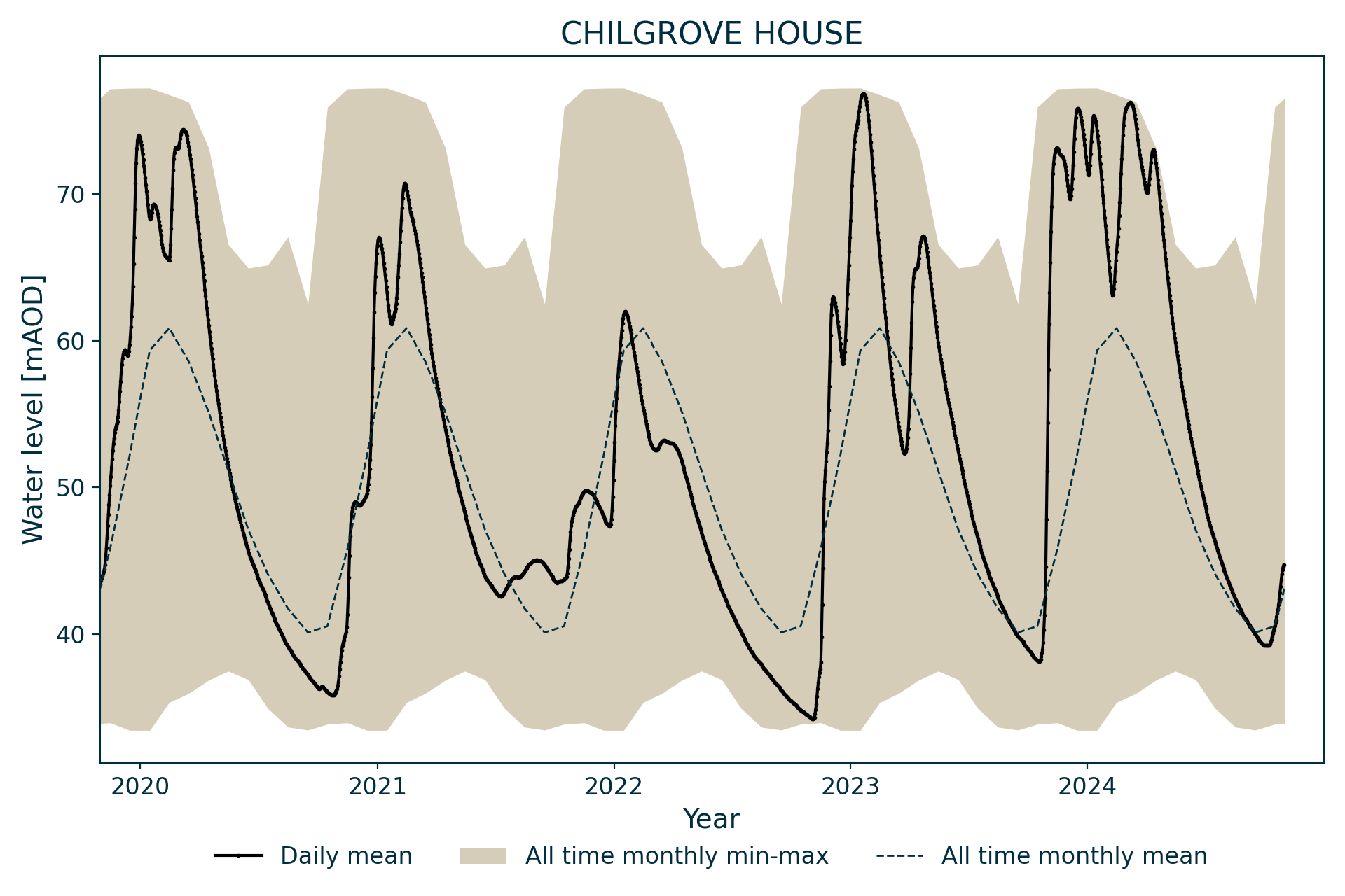 The well shows an annual sinusoidal response typical of the unconfined chalk. Annual fluctuations are usually around 20 to 30 m, but monthly rises in level have exceeded 34 m.