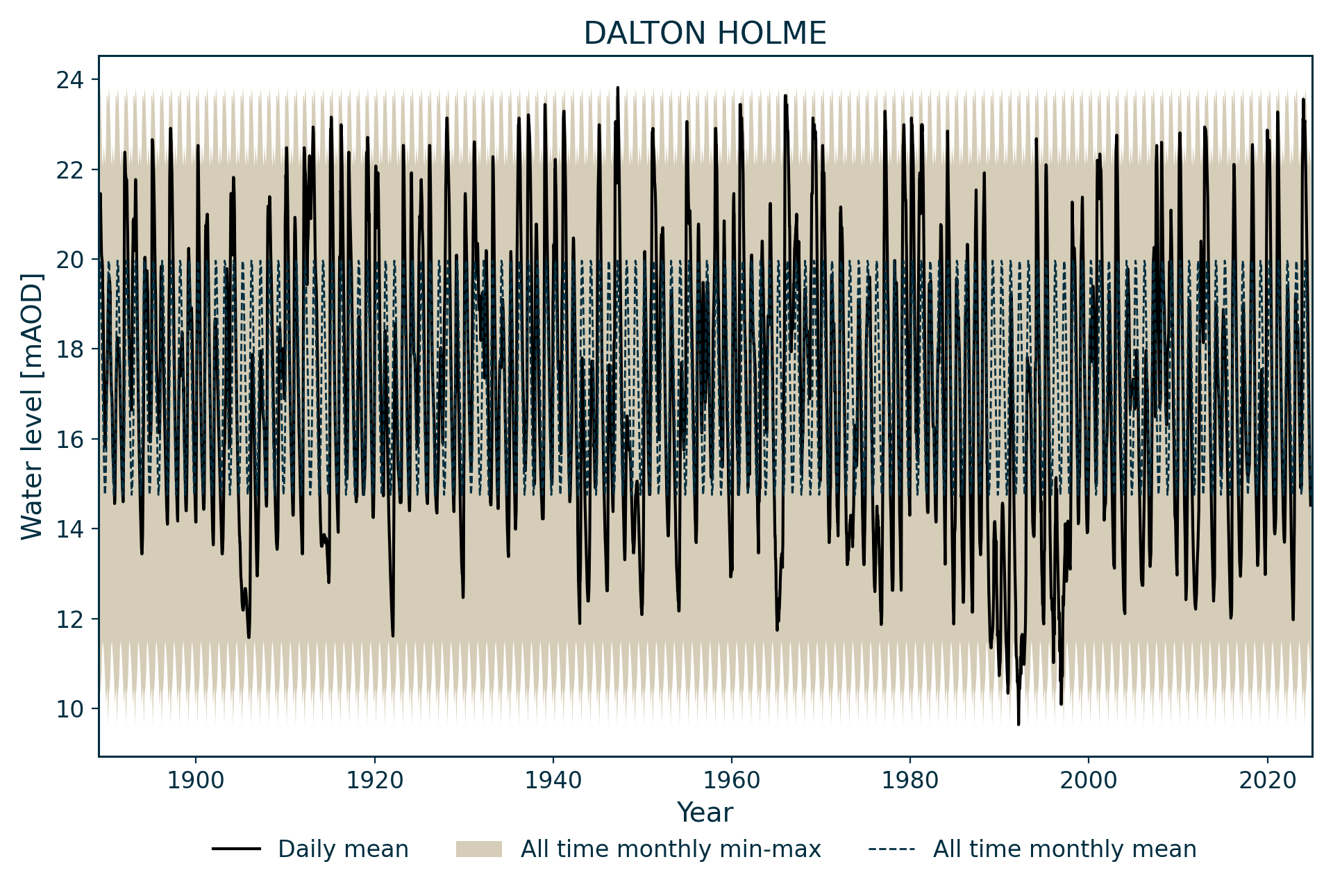 The minimum recorded level is 9.64 m AOD, on 14 February 1992, and the maximum recorded water level is 23.82 m AOD on 30 March 1947. There does appear to be some constraint in both minima and maxima. As the well neither dries up nor overflows, this implies some regional stratigraphical control on levels.