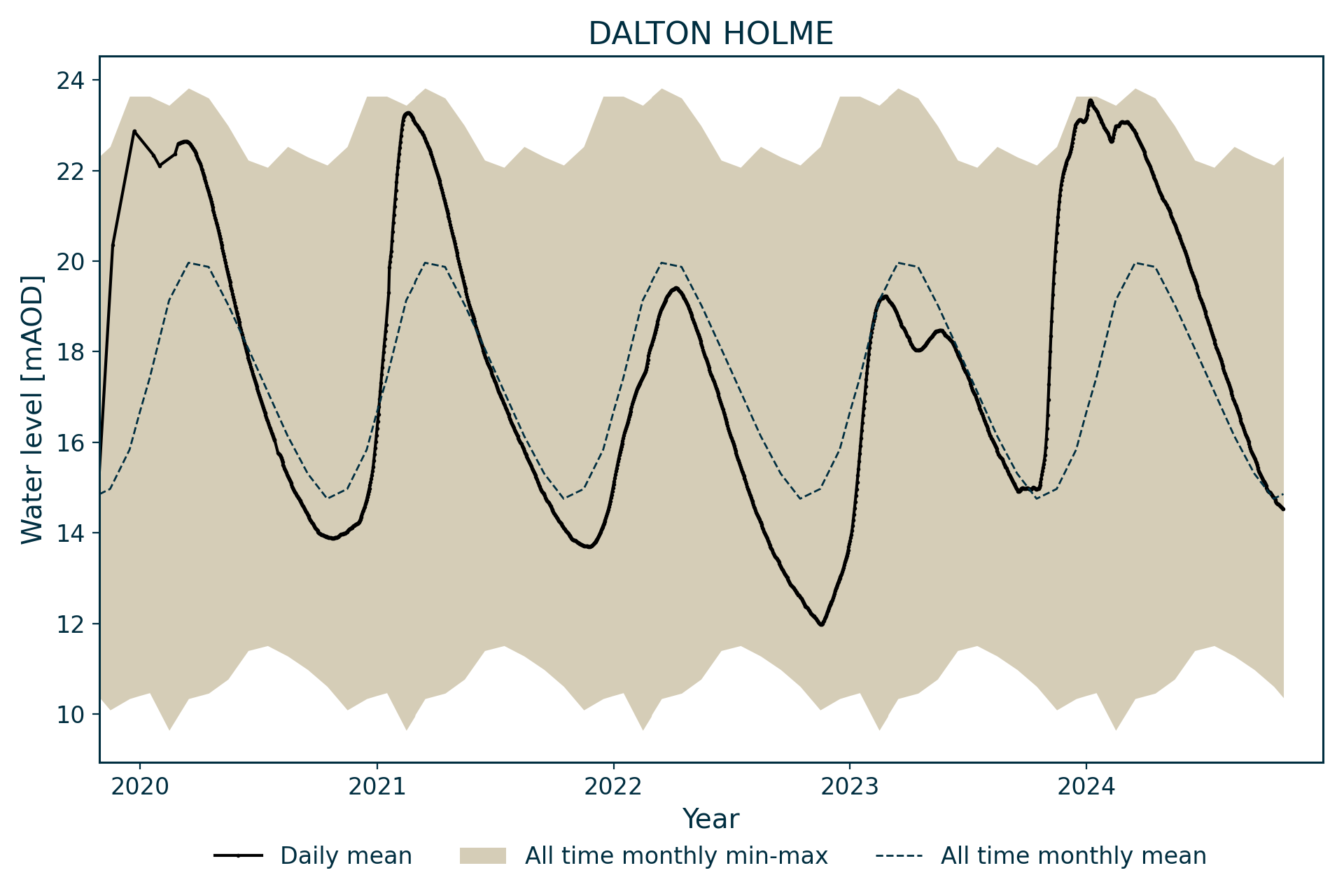 The hydrograph has a broadly sinusoidal appearance, with an absolute recorded range of 14.8 m, although annuual fluctuations are typically around 7 m. The groundwater levels at Dalton Holme respond relatively slowly to rainfall, perhaps influenced by the drift cover.