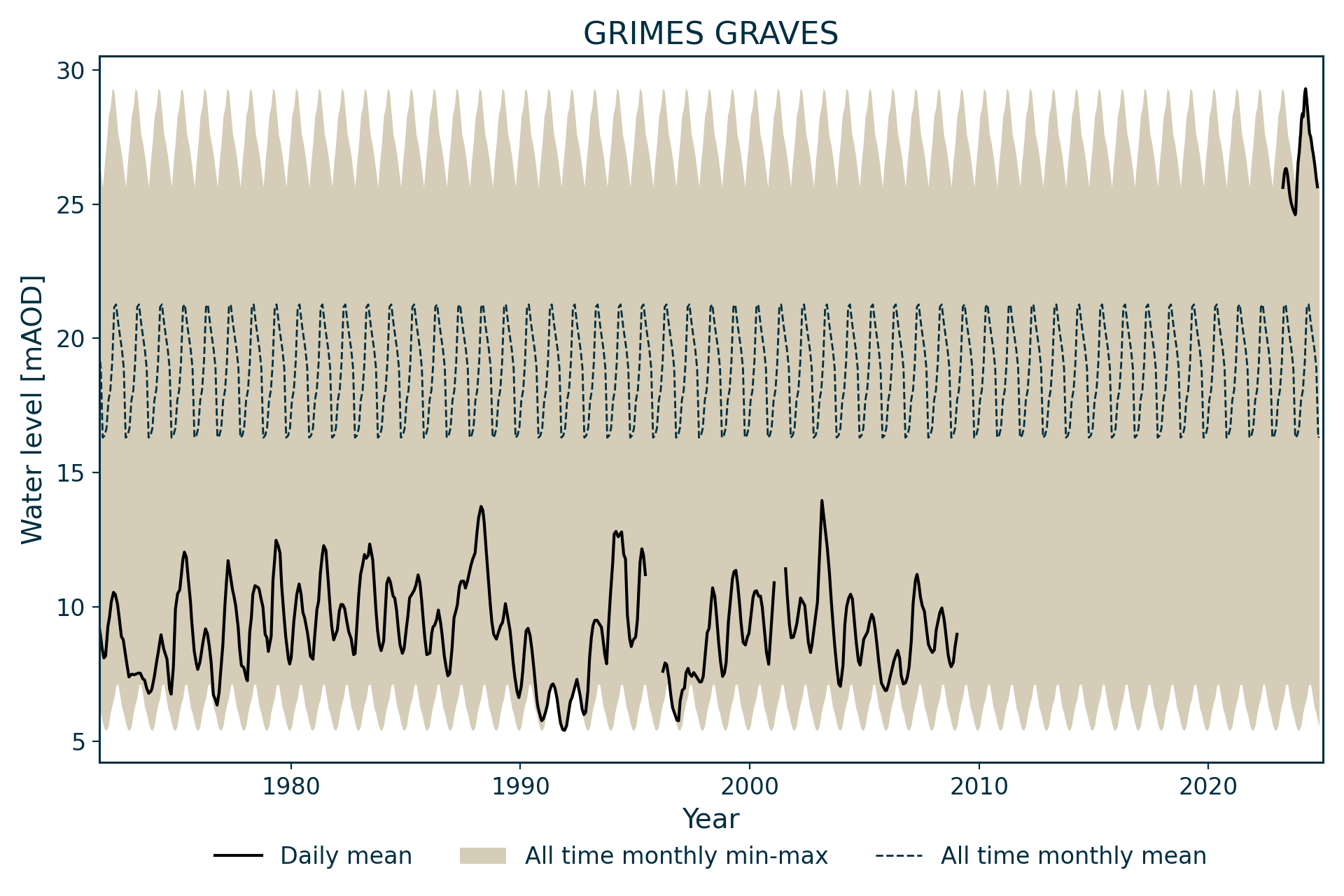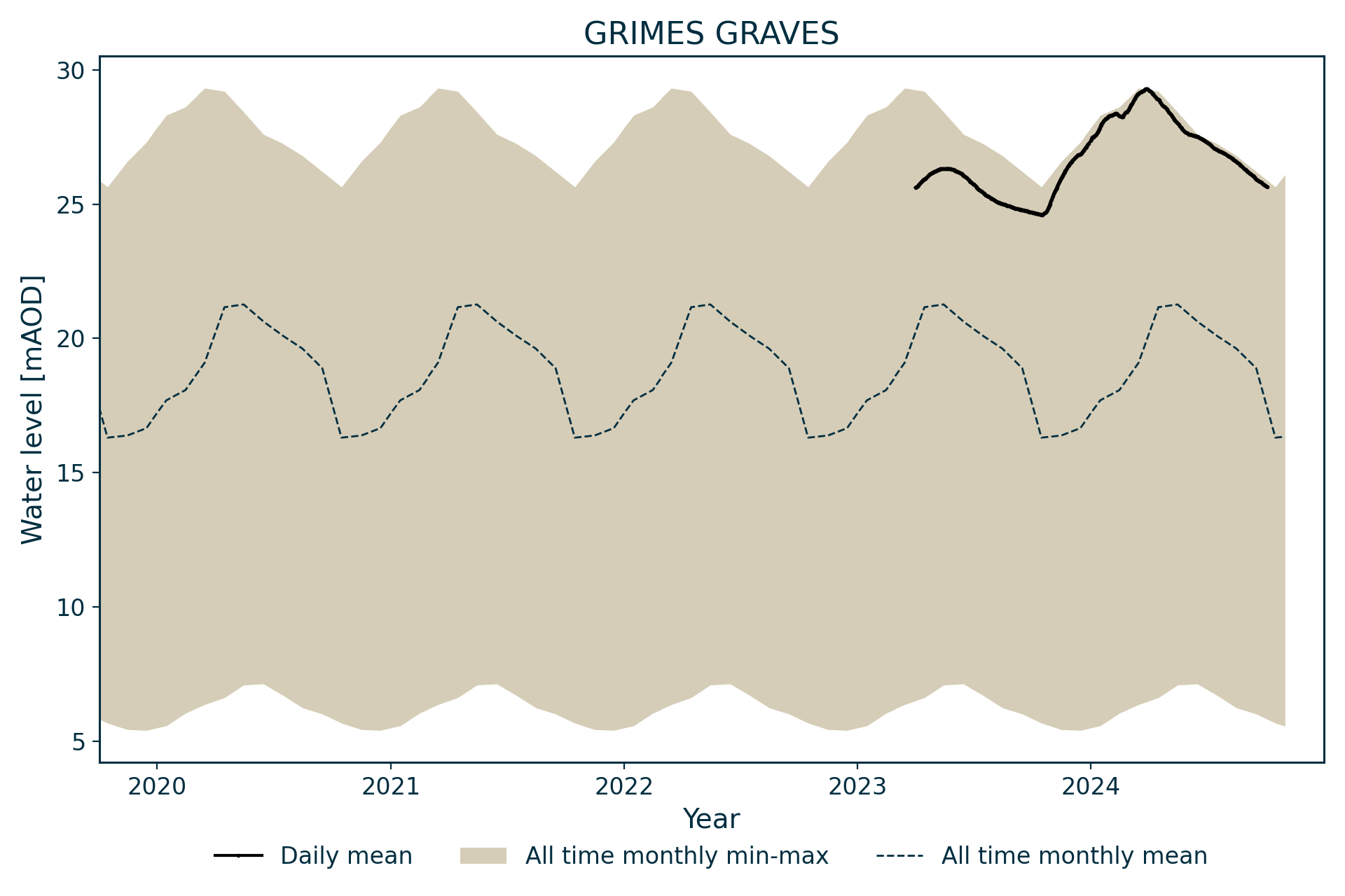 The well at Grimes Graves is used to measure water levels in the unconfined Chalk aquifer to the north-west of Thetford, Norfolk.
