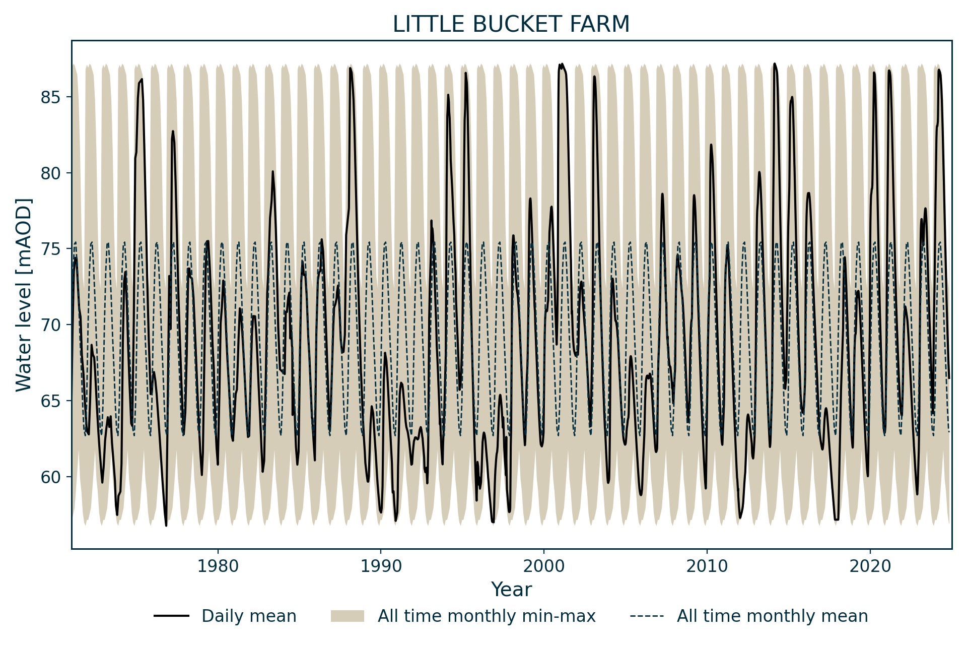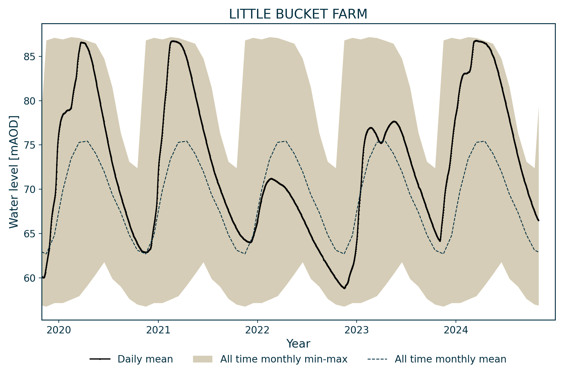 The hydrograph has an annual sinusoidal appearance. Annual fluctuations are normally around 10 m, but have been as high as 2 m in some exceptional years. The extreme limits of its fluctuation are constrained by the well construction, with water nearing ground level in wet years and the well effectively drying up in the driest years.