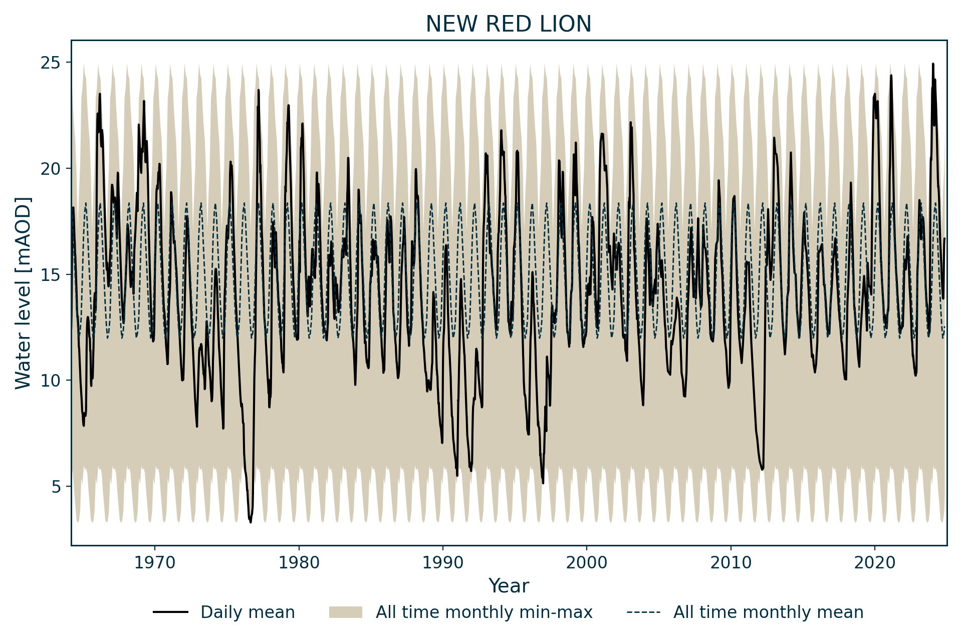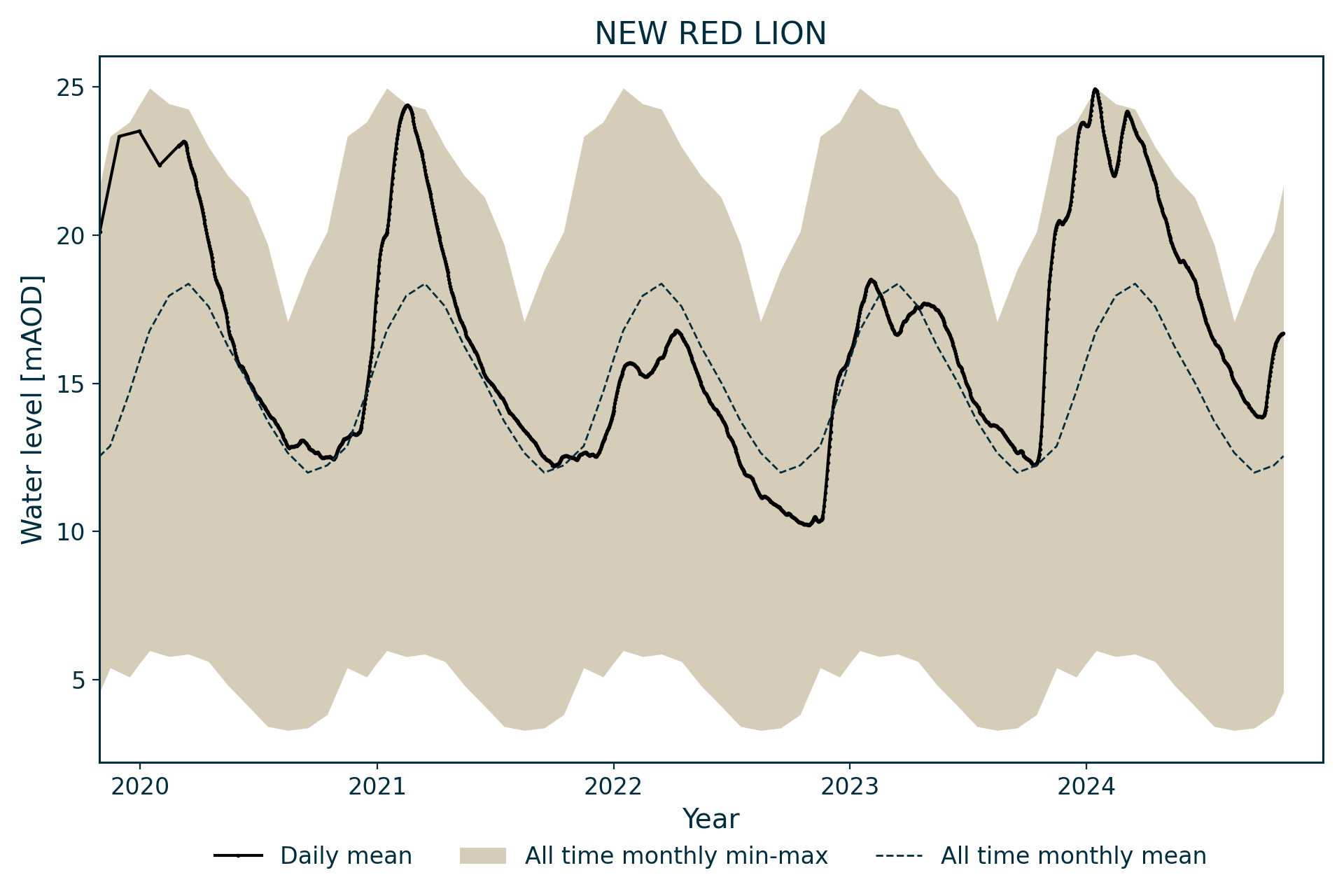 This borehole has been monitored from April 1984 replacing a borehole at Old Red Lion (reference TF03/3, TF 08773039, OD +37.55 m), of a similar depth, 94 m away, which was monitored from March 1964 to January 1981. The records for the period from 21 January 1981 to 31 March 1982 and for 26 April 1982 have been extrapolated from another observation well into the Lincolnshire Limestone Formation at Threekingham (TF 0933 3600), a distance of 5.6 km.