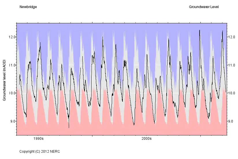 The hydrograph exhibits an annual sinusoidal, but somewhat spiky, response with the water level remaining in the cased out superficial deposits section of the borehole. The minimum water level appears to possibly be controlled by the river level, as the borehole is about 210 m south of Cluden Water.