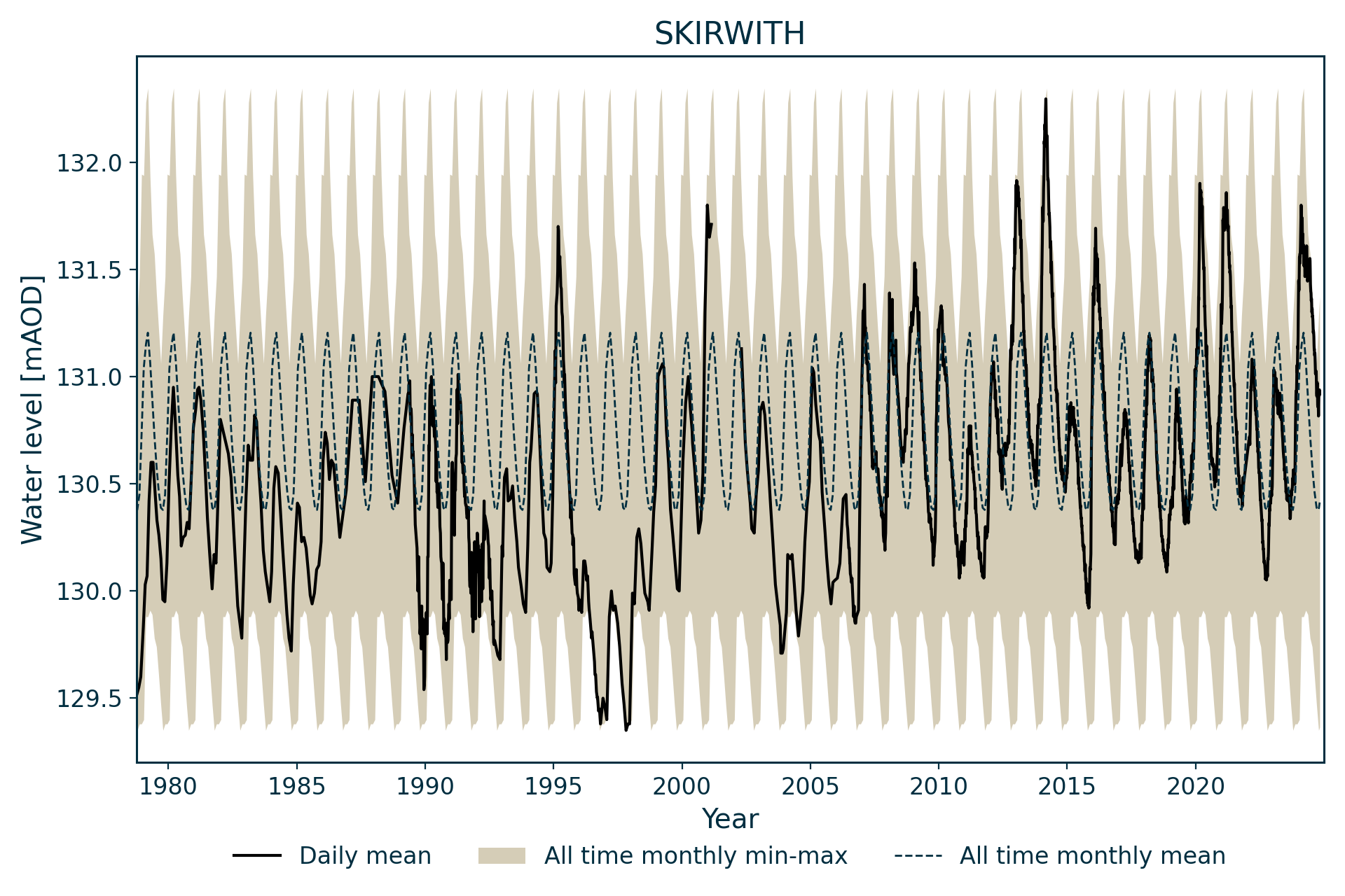Groundwater level timeseries over the full observational record for Skirwith. National Groundwater Level Archive, © UKRI – BGS