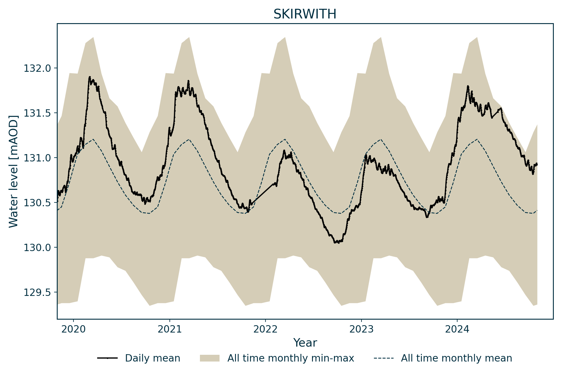 Groundwater level timeseries for the last 5 years of available data for Skirwith. National Groundwater Level Archive, © UKRI – BGS