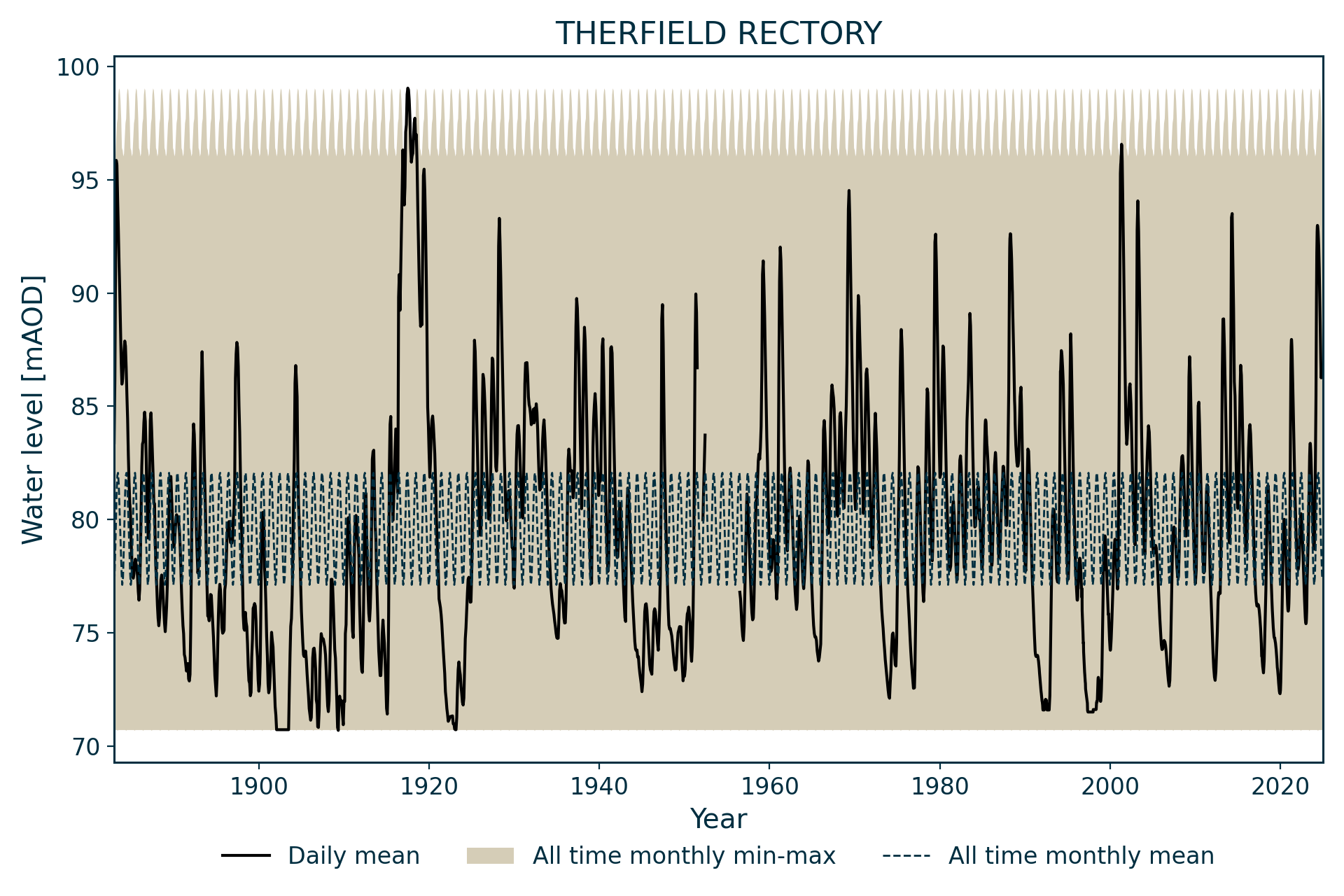 Water levels have been recorded in the Chalk Group at Therfield Rectory in Hertfordshire, south-east England, since 1883. It is one of the few sites with continuous monitoring prior to 1900.