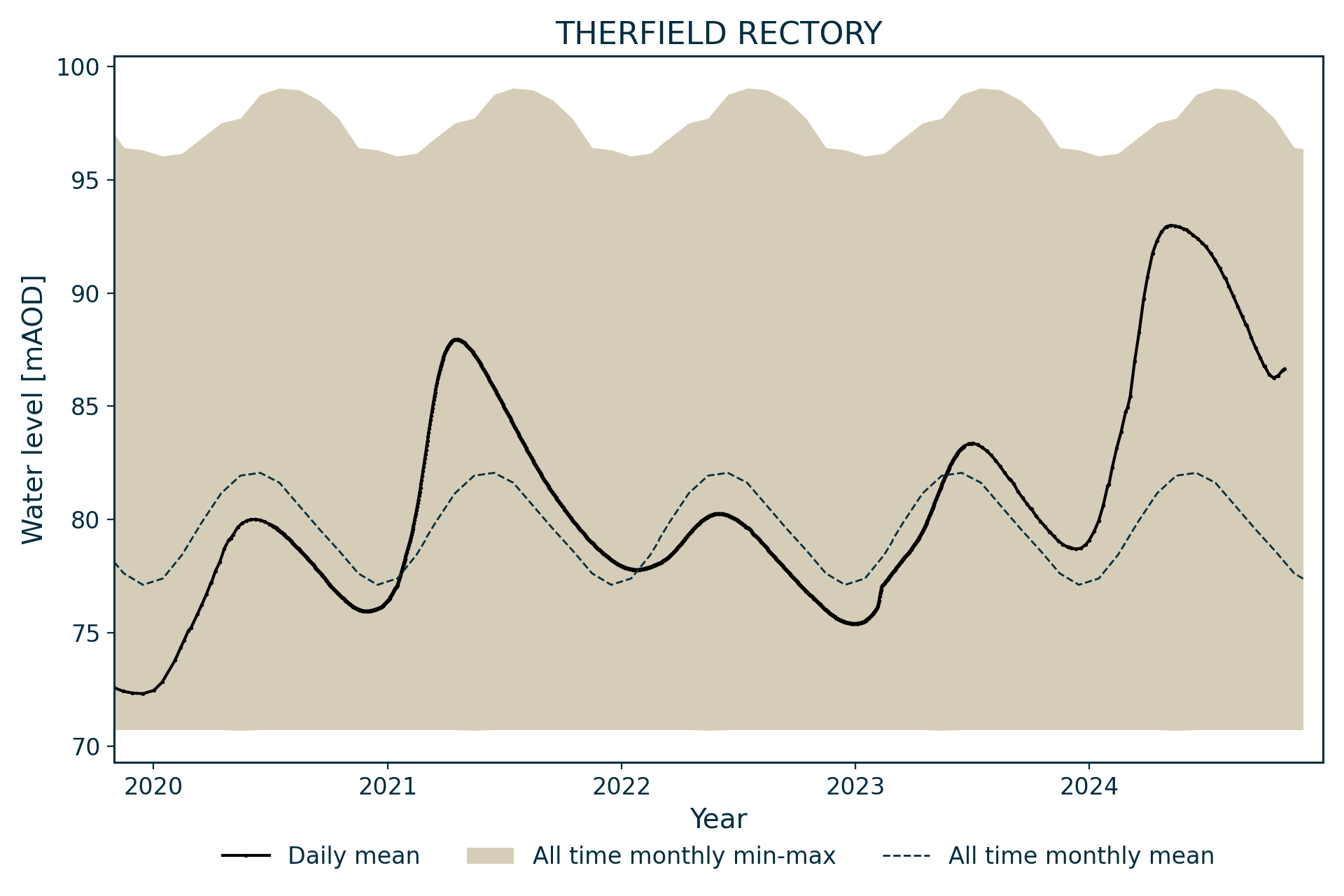 In 1999, a dedicated observation well was constructed at Hay Farm (TL33/67) and this has replaced Therfield Rectory as an index well.
