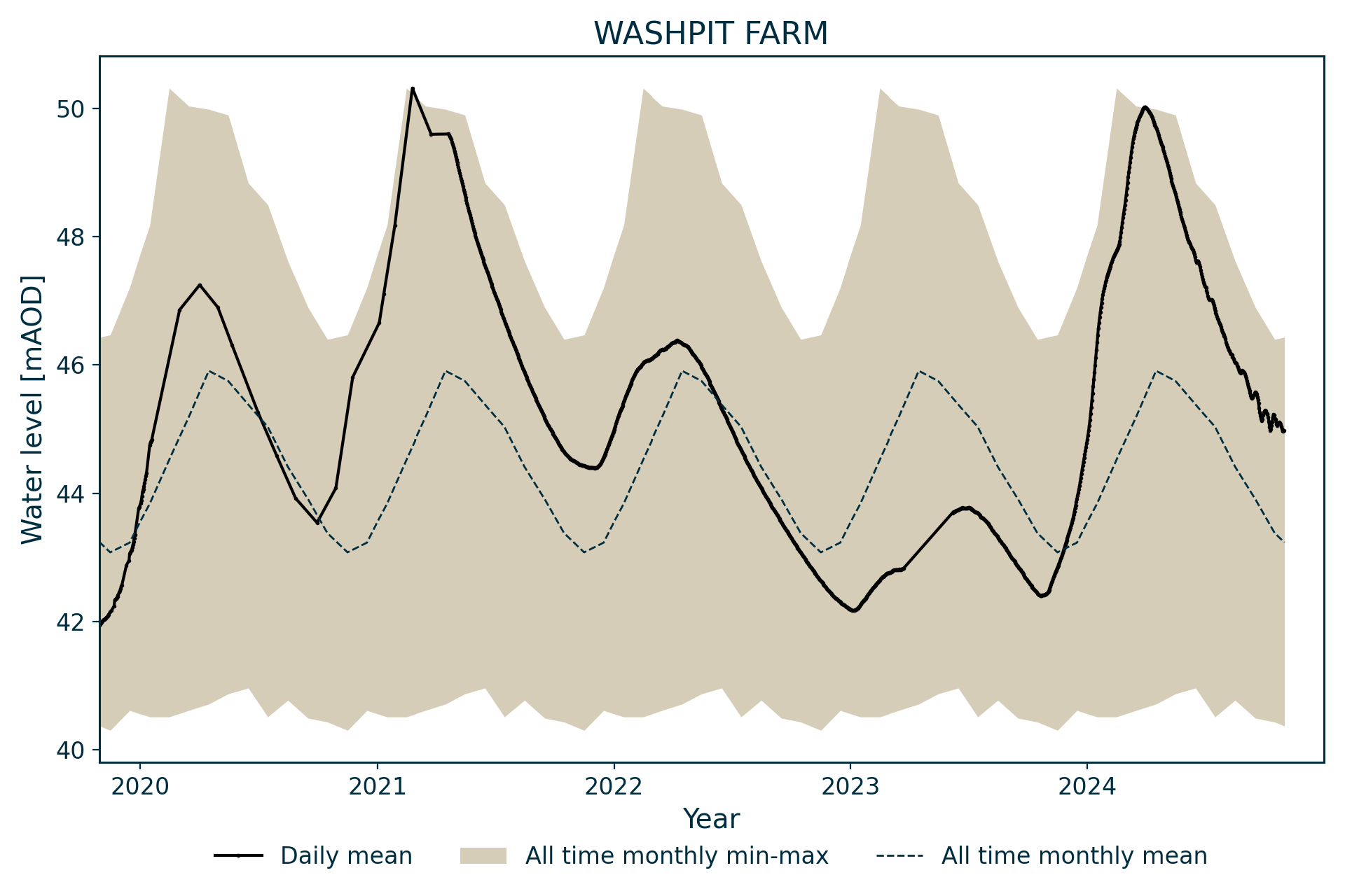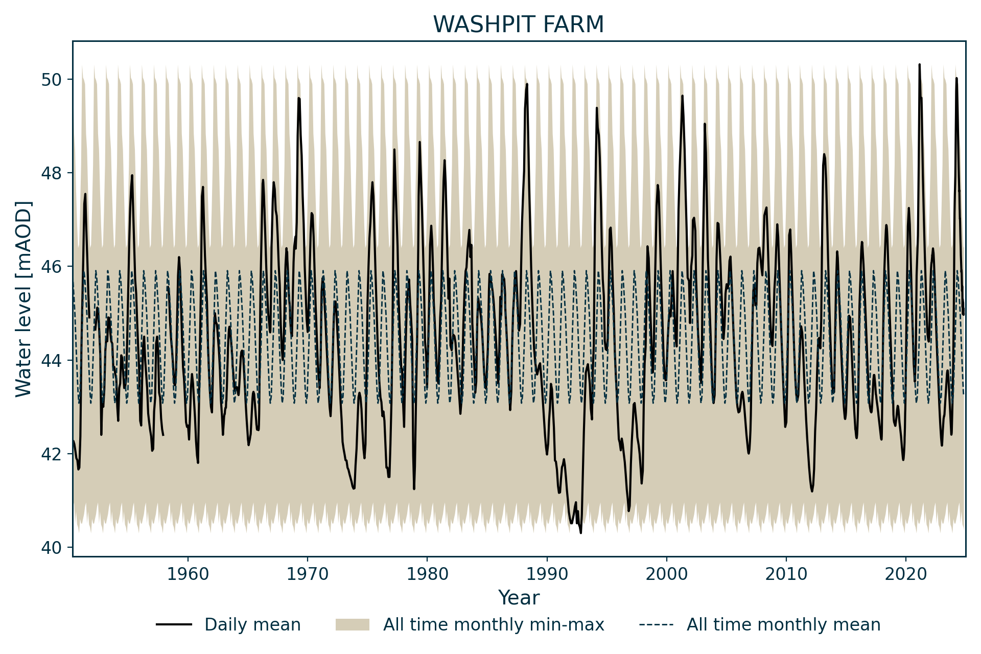 The lowest recorded rest water level of 40.3 m AOD is similar to the shaft depth and therefore it is possible that this constrains the minimum rest water level, although it has only been reached on a single occasion (2 November 1992).