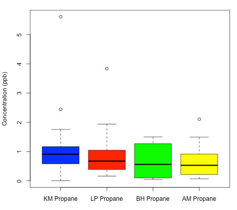 The plots in figures 8, 9 and 10 show the distribution of individual species (ethane, propane and benzene) at the Little Plumpton and Kirby Misperton sites, together with distributions from a site at Auchencorth Moss in Scotland and samples taken from air above BGS’s boreholes around Kirby Misperton. The dataset for hydrocarbons from 2016 is available on the BADC website archive.