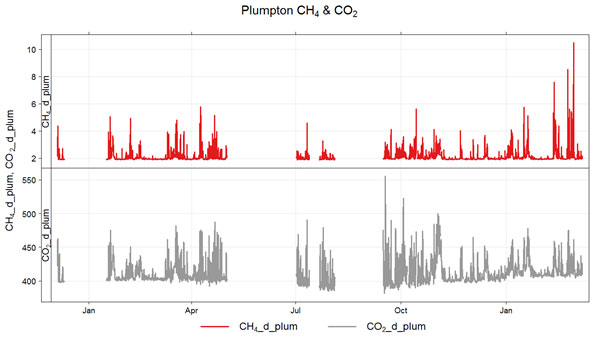 Figure 3  Time series of carbon dioxide (grey) and methane (red) in units of ppm (December 2014 to March 2016). BGS © UKRI.