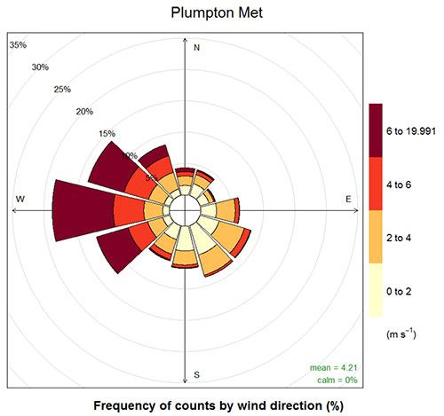 This is important for understanding the local baseline. The position of the site near to the Blackpool shoreline means that winds bringing air from the Atlantic will typically carry relatively well-mixed and background airmasses to the measurement site. (In this context, a ‘background’ can be conceived to be an airmass relatively unaffected by local or regional pollution sources, broadly representative of the average composition of northern hemispheric air at the time.)