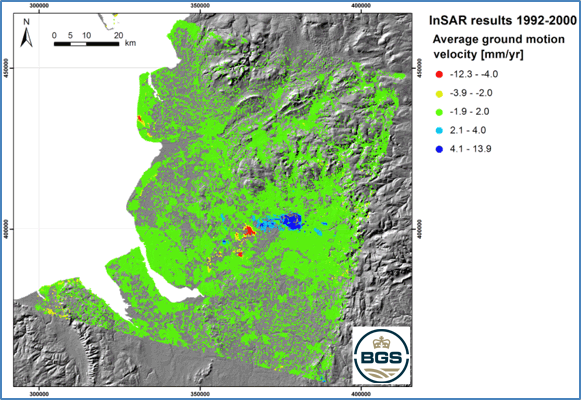 Some preliminary results of ground motion monitoring are shown in Figure 1. The causes of the observed changes are being investigated, but those around Manchester are likely to be related to the former Lancashire coalfield. Further processing needs to be carried out to improve the ground motion results, especially across rural areas.