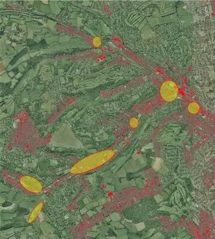 The method considered properties in areas susceptible to groundwater flooding (in red) and information about those affected by 2014 floods (yellow ovals). Aerial photography © UKP/Getmapping Licence No. UKP2006/01 and contains Ordnance Survey data © Crown copyright and database right 2015. BGS © UKRI.