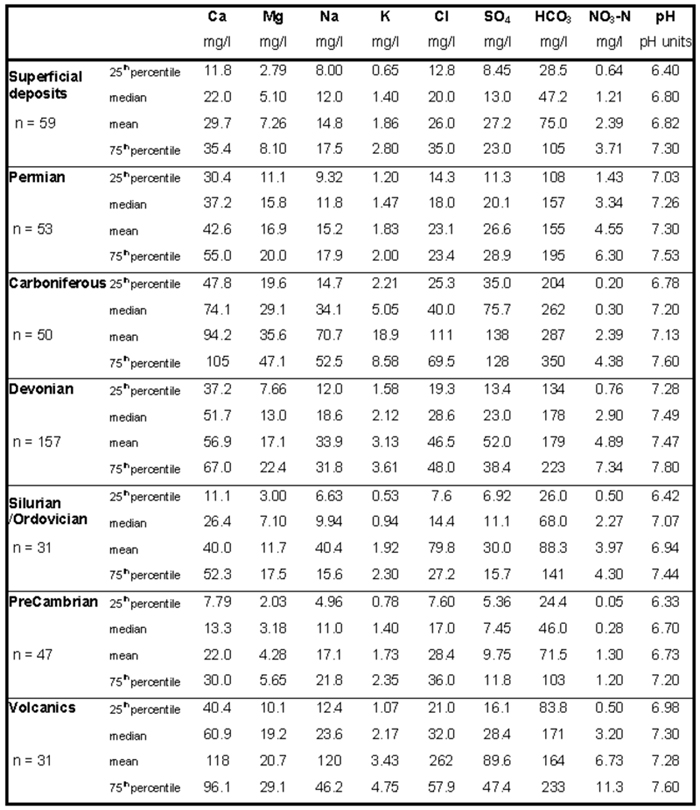 The available data for superficial deposits, Precambrian and Silurian and Ordovician aquifers indicates a similar variability of major ion chemistry. This may reflect the short residence time of much of the water and the high proportion of samples from springs and shallow wells. The waters are typically weakly mineralised, with pH less than 7.