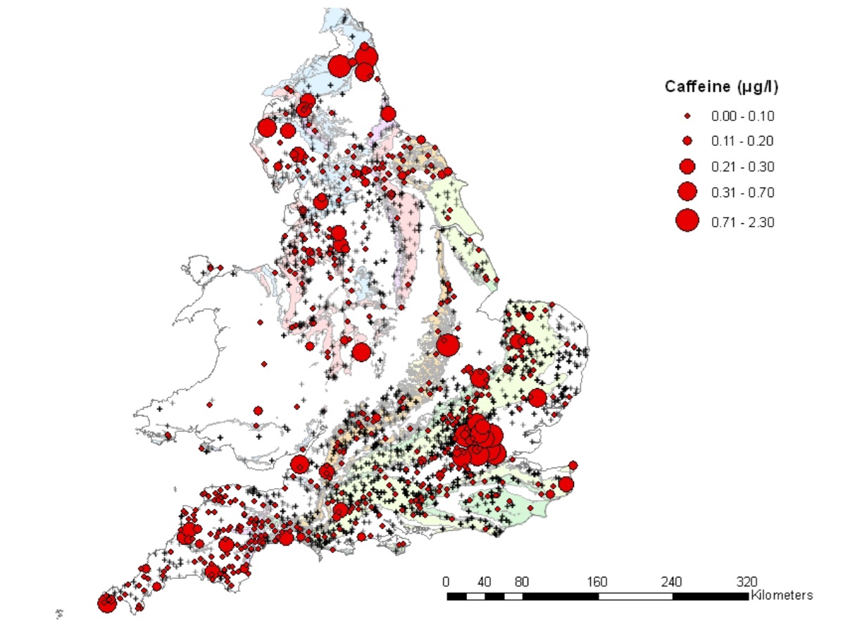Mean concentration of caffeine in groundwater in England and Wales. Data from the Environment Agency’s database. (From Stuart et al, 2001.) BGS © UKRI.