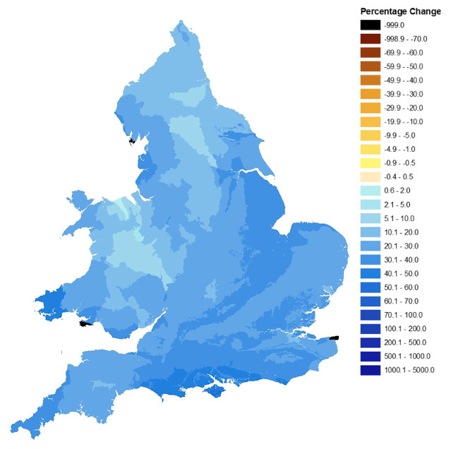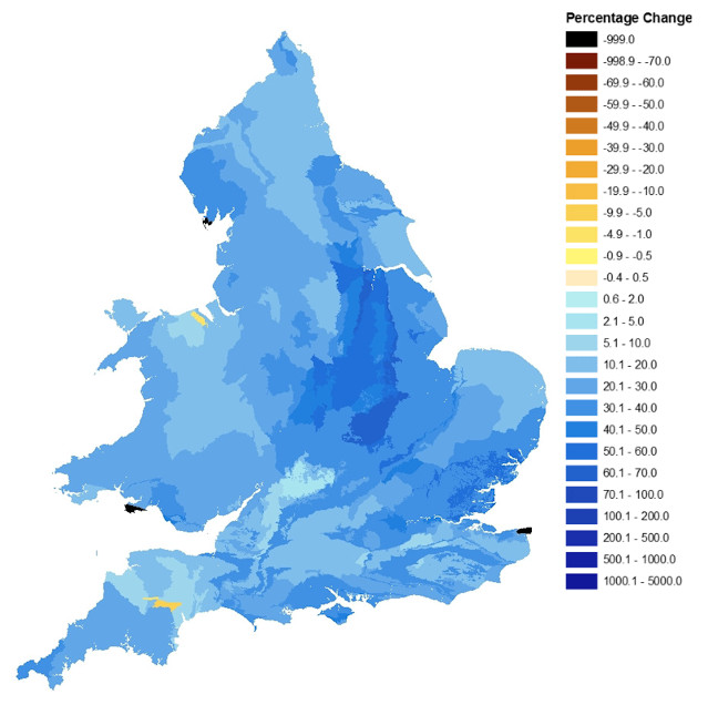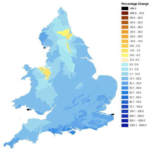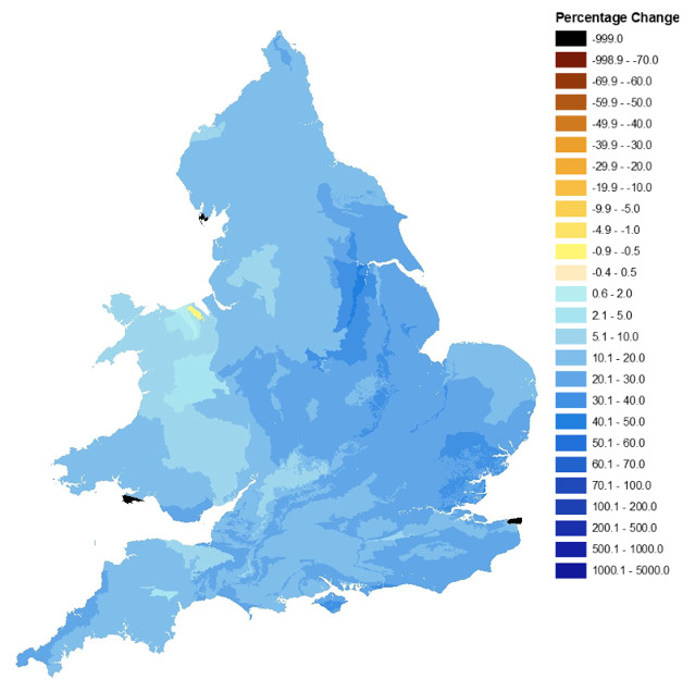The availability of a national-scale, distributed potential recharge model (ZOODRM) offers the opportunity to study possible infiltration recharge under future climates. We produced 150-year simulations of potential recharge using the UKCP09 projections of climate change in the UK (Web Archive link) from the Met Office Hadley Centre. Future potential recharge values were compared to the historical values to estimate the spatial changes in potential recharge.