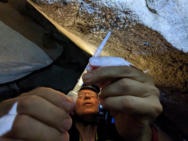 Attention turned to the weathered ‘paste’ seen on many passage walls. This turned out to be teeming with microbial life, in some places containing a higher microbial cell count than cultured yogurt. Analysis of condensation water droplets on the cave walls revealed extraordinarily high levels of nitrate (up to 7000 mg/l; for comparison, the UK drinking water standard is 150 mg/l), whilst drips feeding the stalagmites had little or no nitrate.