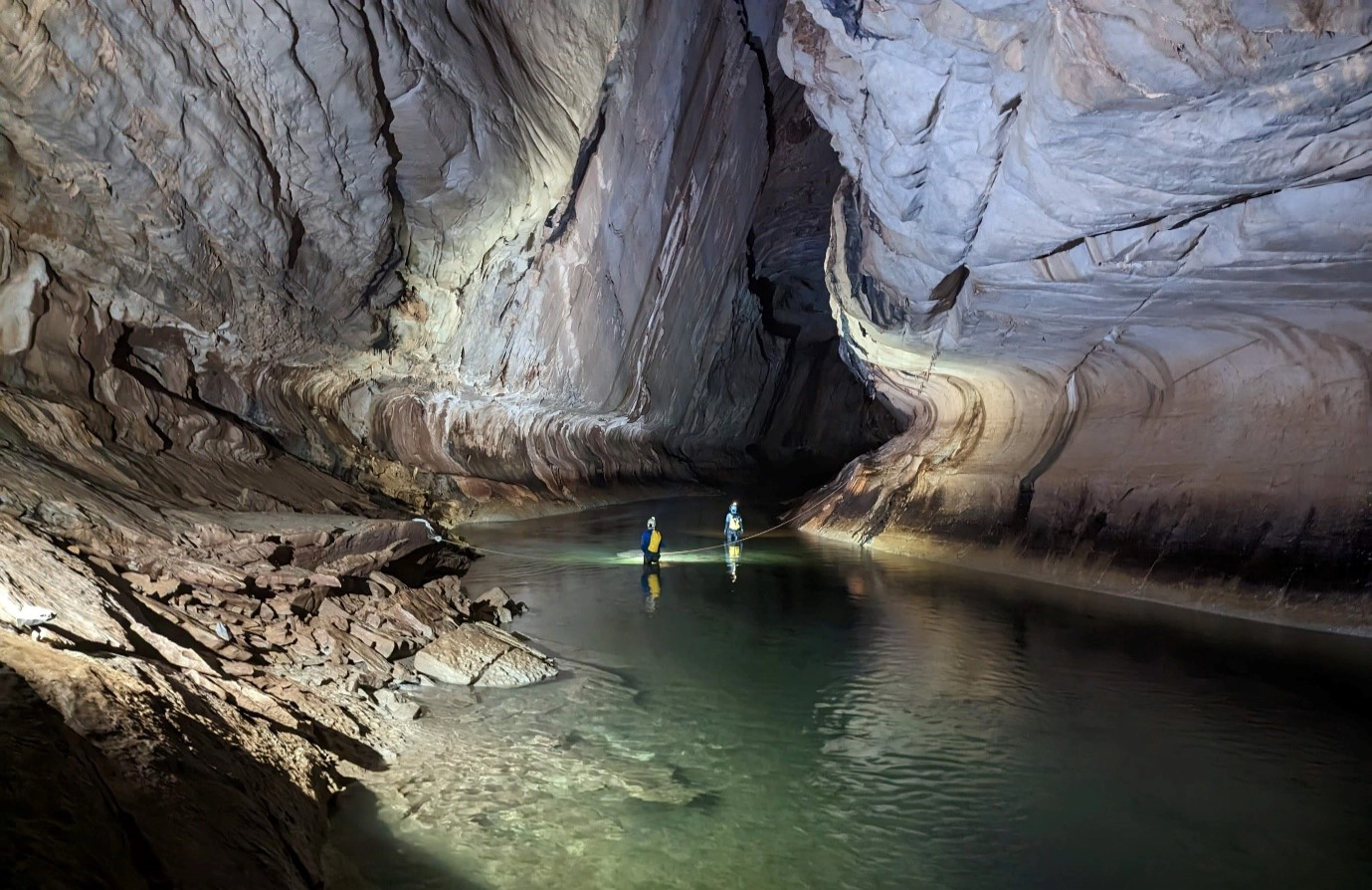 The Clearwater streamway is probably one of the finest cave passages in the world. Not only is there the prospect of new scientific discoveries, but also the chance to explore new cave passages where no human has ever trodden. On one trip, the team crawled through a flat-out squeeze to emerge into an undiscovered chamber over 200 m long, 70 m wide and 50 m high (big enough to hold two Airbus A380 jets) and adorned with 20 m-high stalagmites.