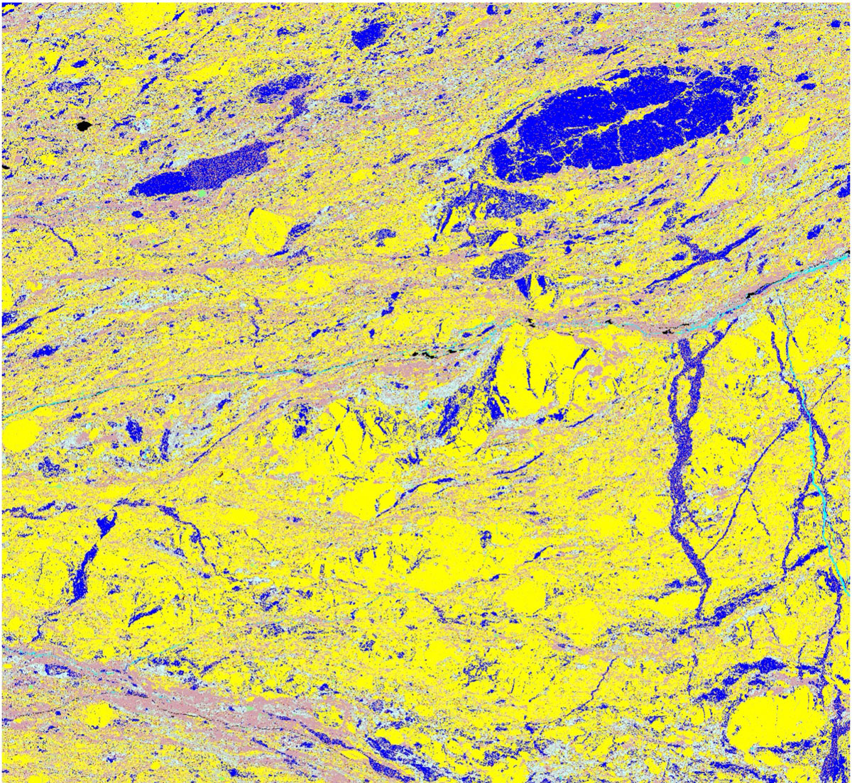Mineral map image of Great Glen Fault rock generated using a scanning electron microscope. The pale purple-pink areas are formed by interconnected networks of weak clay minerals formed due to alteration of the host rock, which shearing has localised. Pale and dark blue areas are regions of later carbonate veins and cement. Image is 5mm wide. BGS © UKRI.